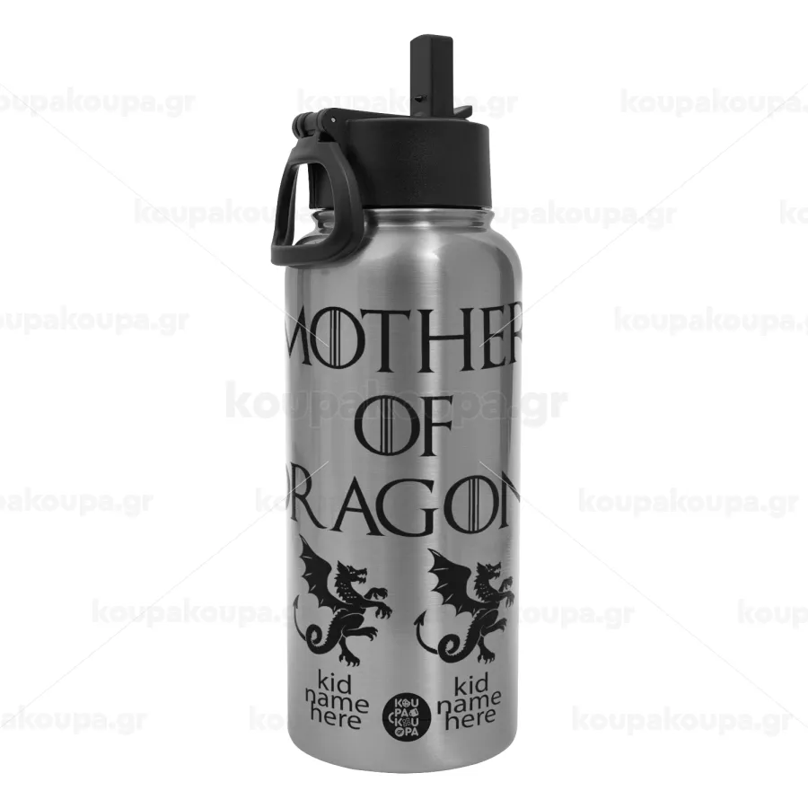 GOT, Mother of Dragons (με ονόματα παιδικά), Metal mug thermo Silver with Straw and Spout Lid (Stainless steel), double wall, 950ml