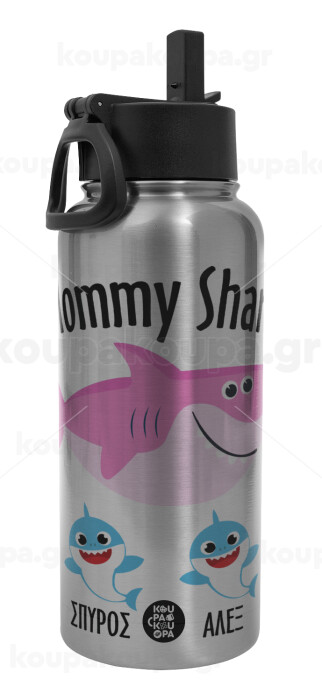 Mommy Shark (με ονόματα παιδικά), Metal mug thermo Silver with Straw and Spout Lid (Stainless steel), double wall, 950ml