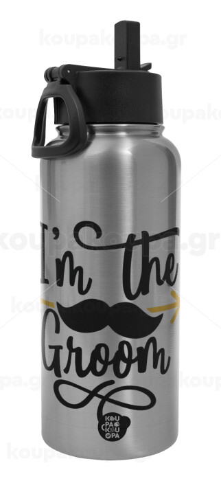 I'm the groom mustache, Metal mug thermo Silver with Straw and Spout Lid (Stainless steel), double wall, 950ml