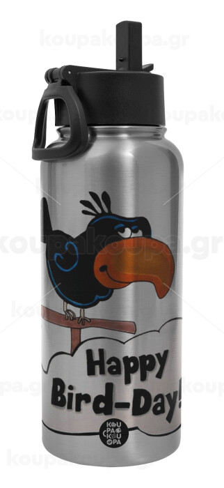 Happy Bird Day, Metal mug thermo Silver with Straw and Spout Lid (Stainless steel), double wall, 950ml