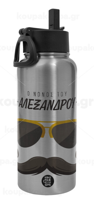 Ο νονός μου, μουστάκι με γυαλιά, Metal mug thermo Silver with Straw and Spout Lid (Stainless steel), double wall, 950ml