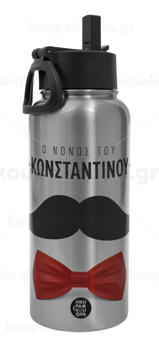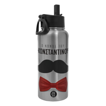 Ο νονός μου, μουστάκι με παπιγιόν, Metal mug thermo Silver with Straw and Spout Lid (Stainless steel), double wall, 950ml