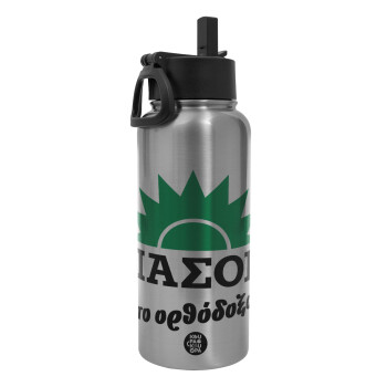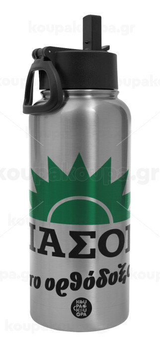 PASOK the orthodoxo, Metal mug thermo Silver with Straw and Spout Lid (Stainless steel), double wall, 950ml