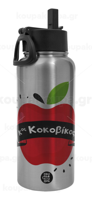Αναμνηστικό Δώρο Δασκάλου Κόκκινο Μήλο, Metal mug thermo Silver with Straw and Spout Lid (Stainless steel), double wall, 950ml