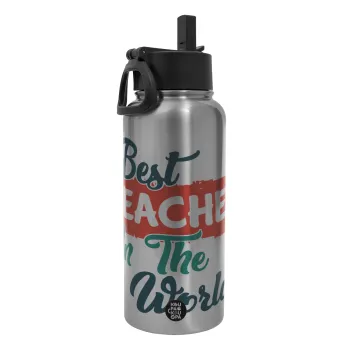 Best teacher in the World!, Metal mug thermo Silver with Straw and Spout Lid (Stainless steel), double wall, 950ml