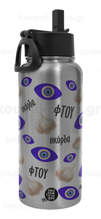 Φτου, φτου, σκόρδα!!!, Metal mug thermo Silver with Straw and Spout Lid (Stainless steel), double wall, 950ml