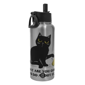 CAT, what are you going to do about it!, Metal mug thermo Silver with Straw and Spout Lid (Stainless steel), double wall, 950ml
