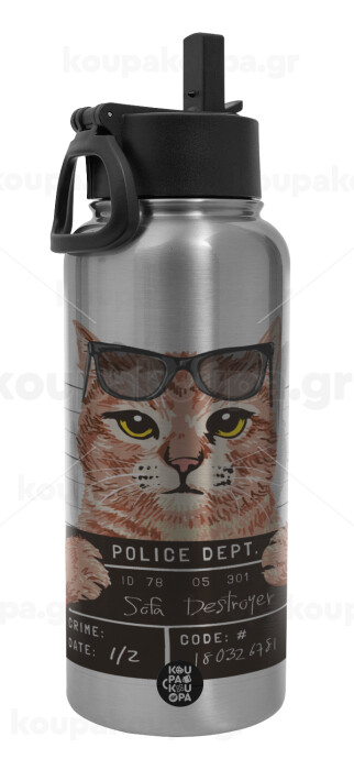 Cool cat, Metal mug thermo Silver with Straw and Spout Lid (Stainless steel), double wall, 950ml