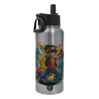 Ash Ketchum & Pikachu, Metal mug thermo Silver with Straw and Spout Lid (Stainless steel), double wall, 950ml
