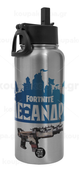 Fortnite with gun με το όνομα σου, Metal mug thermo Silver with Straw and Spout Lid (Stainless steel), double wall, 950ml