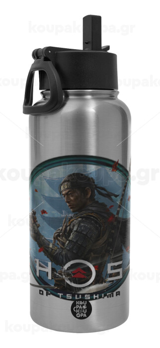 Ghost of Tsushima, Metal mug thermo Silver with Straw and Spout Lid (Stainless steel), double wall, 950ml