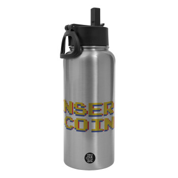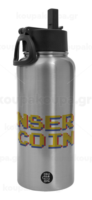 Insert coin!!!, Metal mug thermo Silver with Straw and Spout Lid (Stainless steel), double wall, 950ml