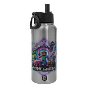 Minecraft Nether Portal, Metal mug thermo Silver with Straw and Spout Lid (Stainless steel), double wall, 950ml
