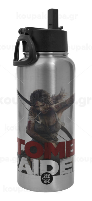 Tomb raider, Metal mug thermo Silver with Straw and Spout Lid (Stainless steel), double wall, 950ml