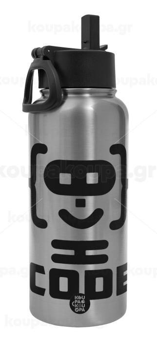 Code Heroes symbol, Metal mug thermo Silver with Straw and Spout Lid (Stainless steel), double wall, 950ml