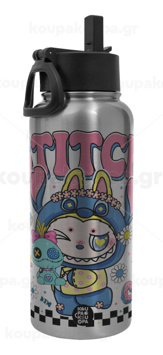 Labubu Stitch, Metal mug thermo Silver with Straw and Spout Lid (Stainless steel), double wall, 950ml