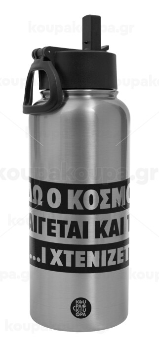 Εδώ ο κόσμος καίγεται και το Μ....Ι χτενίζεται, Metal mug thermo Silver with Straw and Spout Lid (Stainless steel), double wall, 950ml