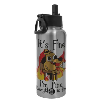 It's Fine I'm Fine Everything Is Fine, Metal mug thermo Silver with Straw and Spout Lid (Stainless steel), double wall, 950ml