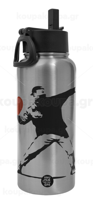 Banksy (The heart thrower), Metal mug thermo Silver with Straw and Spout Lid (Stainless steel), double wall, 950ml