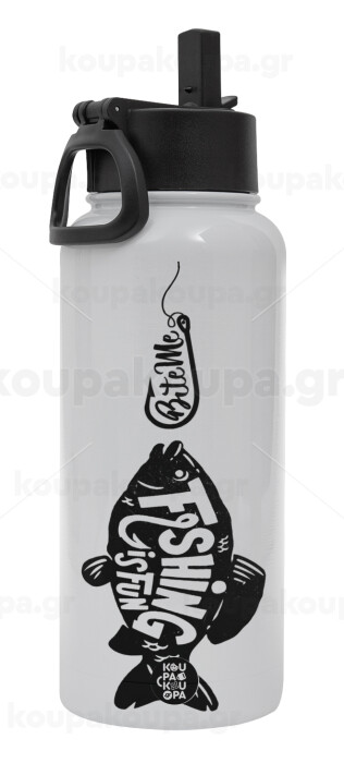 Fishing is fun, Metal mug thermo White with Straw and Spout Lid (Stainless steel), double wall, 950ml