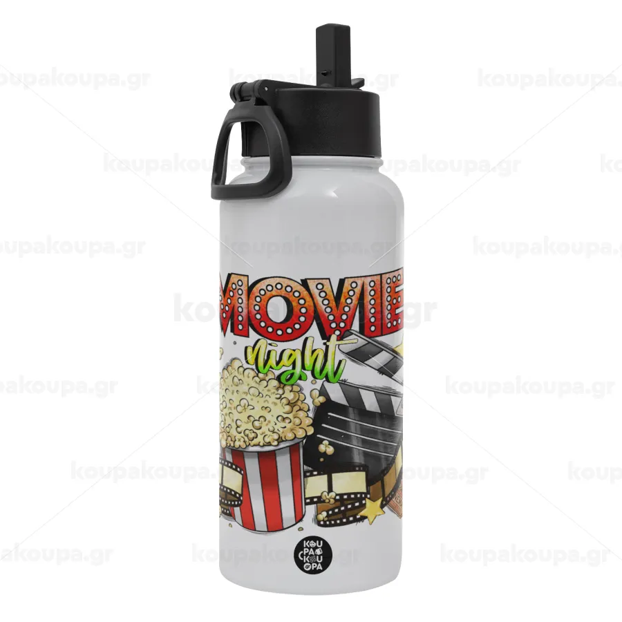 Movie night, Metal mug thermo White with Straw and Spout Lid (Stainless steel), double wall, 950ml