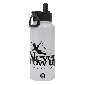 Peter pan, Never Grow UP, Metal mug thermo White with Straw and Spout Lid (Stainless steel), double wall, 950ml