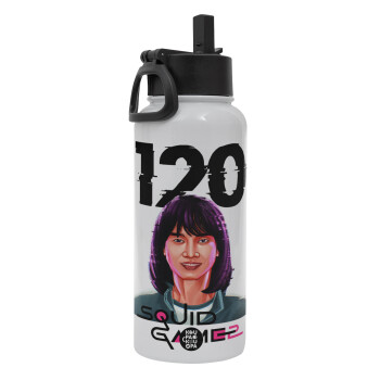 Squid game 120 Cho Hyun-ju, Metal mug thermo White with Straw and Spout Lid (Stainless steel), double wall, 950ml