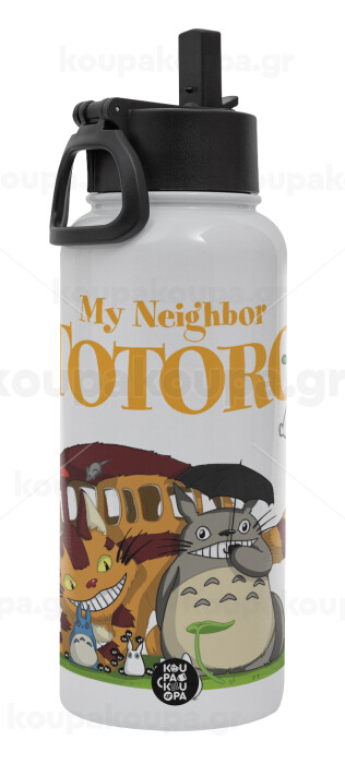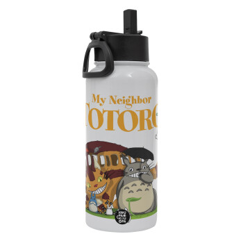 Totoro and Cat, Metal mug thermo White with Straw and Spout Lid (Stainless steel), double wall, 950ml