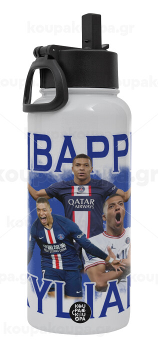 Kylian Mbappé, Metal mug thermo White with Straw and Spout Lid (Stainless steel), double wall, 950ml