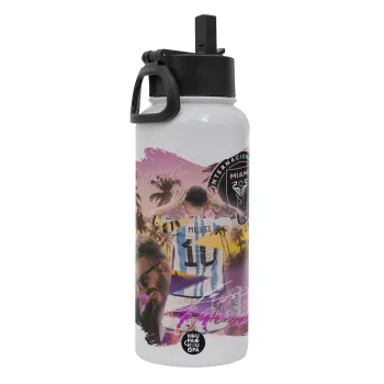 Lionel Messi Miami, Metal mug thermo White with Straw and Spout Lid (Stainless steel), double wall, 950ml