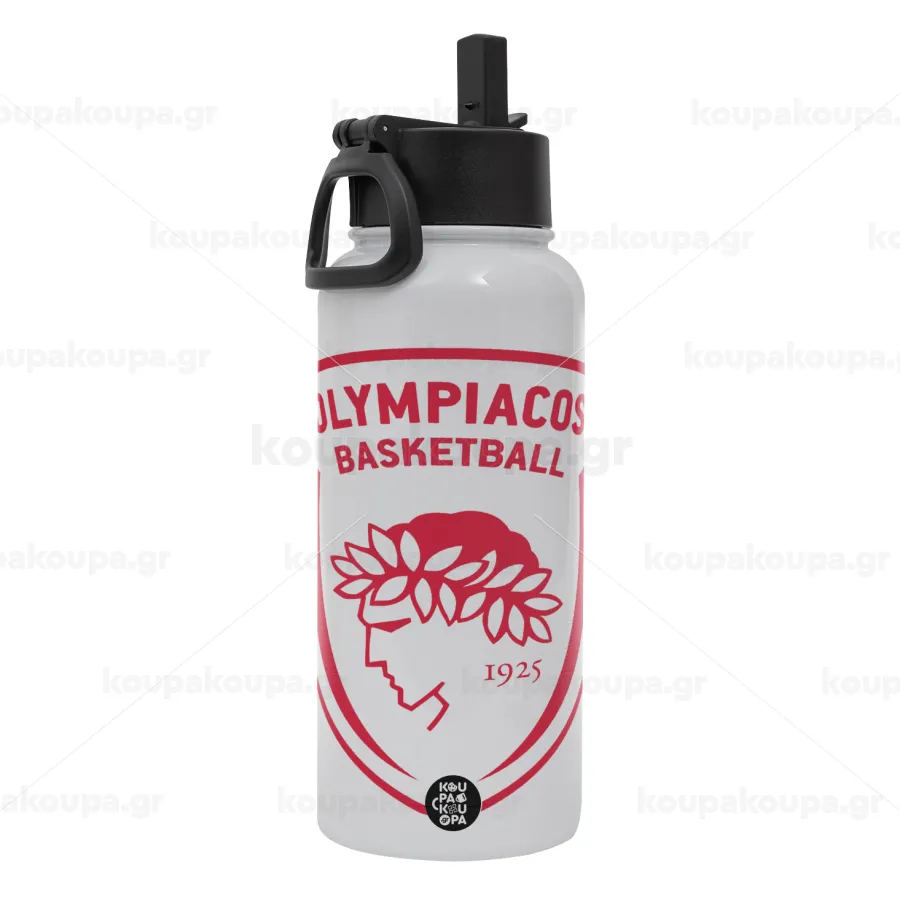 Olympiacos B.C., Metal mug thermo White with Straw and Spout Lid (Stainless steel), double wall, 950ml
