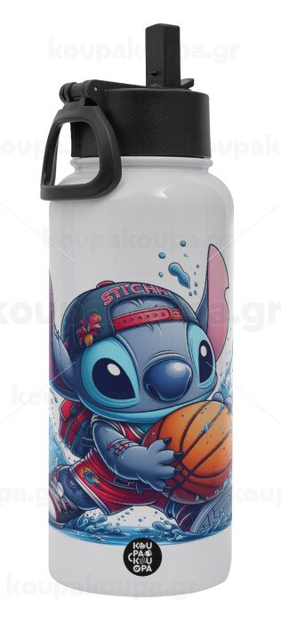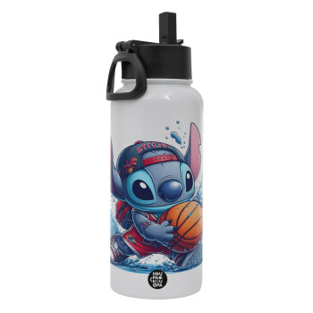 Stitch Basketball, Metal mug thermo White with Straw and Spout Lid (Stainless steel), double wall, 950ml