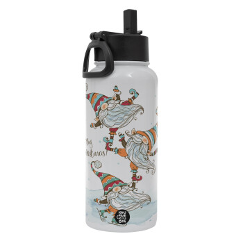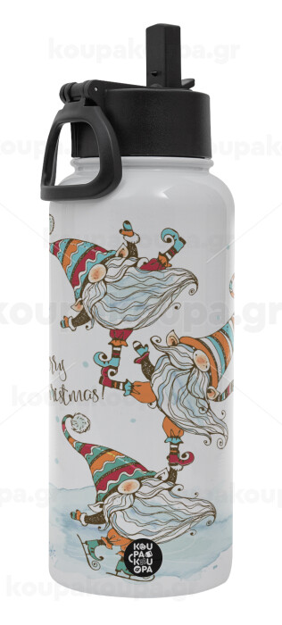Christmas nordic gnomes, Metal mug thermo White with Straw and Spout Lid (Stainless steel), double wall, 950ml