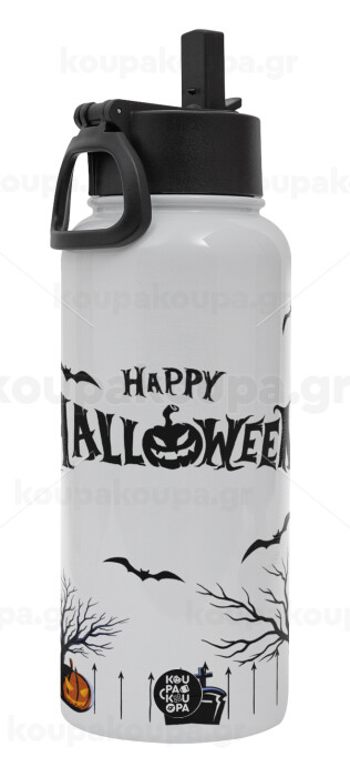 Happy Halloween cemetery, Metal mug thermo White with Straw and Spout Lid (Stainless steel), double wall, 950ml