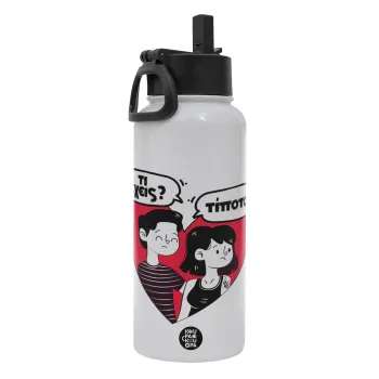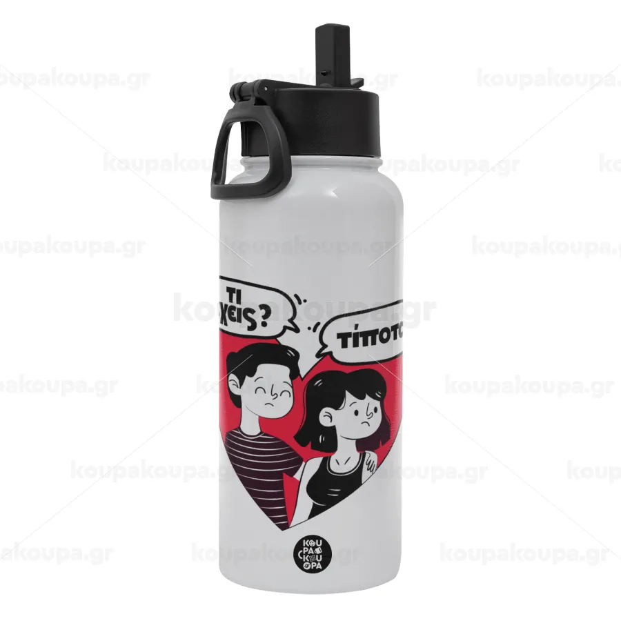 Τι έχεις? Τίποτα!, Metal mug thermo White with Straw and Spout Lid (Stainless steel), double wall, 950ml