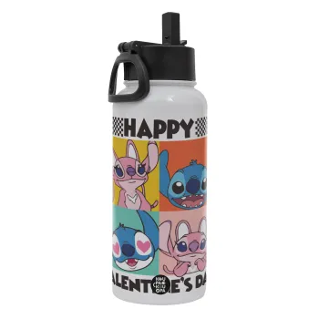 Lilo & Stitch Happy valentines day, Metal mug thermo White with Straw and Spout Lid (Stainless steel), double wall, 950ml