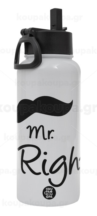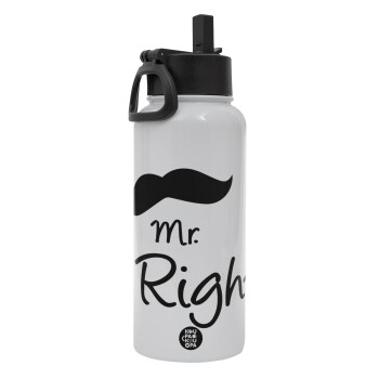 Mr right Mustache, Metal mug thermo White with Straw and Spout Lid (Stainless steel), double wall, 950ml