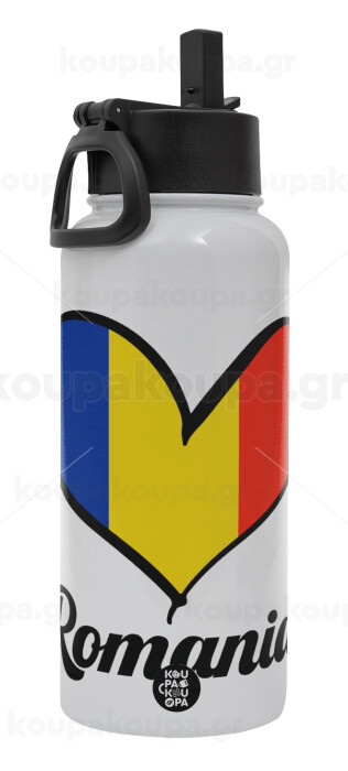 Romania flag, Metal mug thermo White with Straw and Spout Lid (Stainless steel), double wall, 950ml