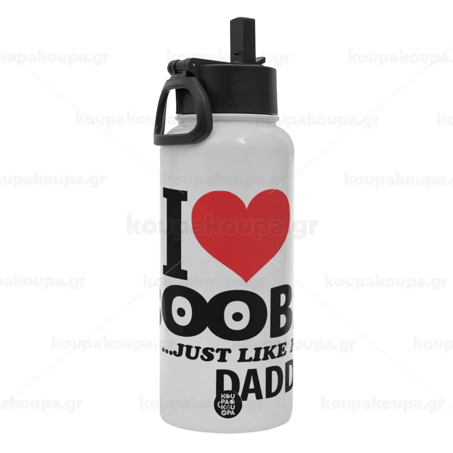 I Love boobs ...just like my daddy, Metal mug thermo White with Straw and Spout Lid (Stainless steel), double wall, 950ml