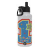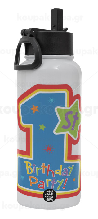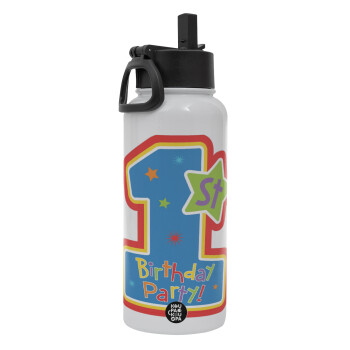 Happy 1st Birthday, Metal mug thermo White with Straw and Spout Lid (Stainless steel), double wall, 950ml