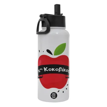 Αναμνηστικό Δώρο Δασκάλου Κόκκινο Μήλο, Metal mug thermo White with Straw and Spout Lid (Stainless steel), double wall, 950ml