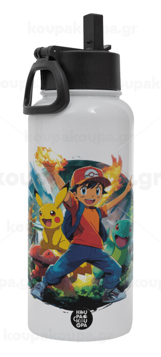 Ash Ketchum & Pikachu, Metal mug thermo White with Straw and Spout Lid (Stainless steel), double wall, 950ml
