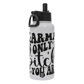 Karma is Only A Bitch if You Are, Metal mug thermo White with Straw and Spout Lid (Stainless steel), double wall, 950ml
