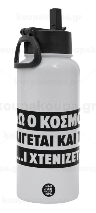 Εδώ ο κόσμος καίγεται και το Μ....Ι χτενίζεται, Metal mug thermo White with Straw and Spout Lid (Stainless steel), double wall, 950ml