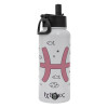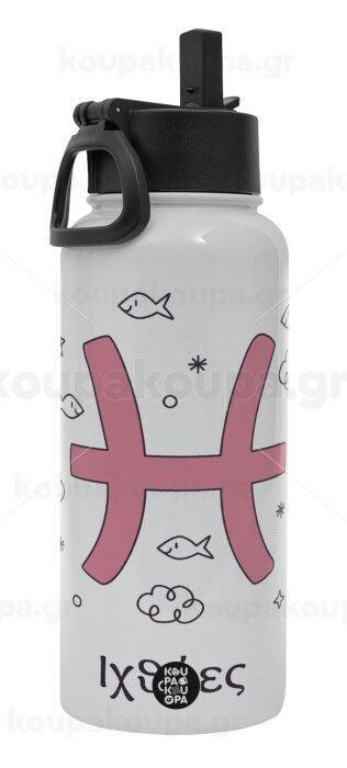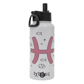 Ζώδια Ιχθύες, Metal mug thermo White with Straw and Spout Lid (Stainless steel), double wall, 950ml
