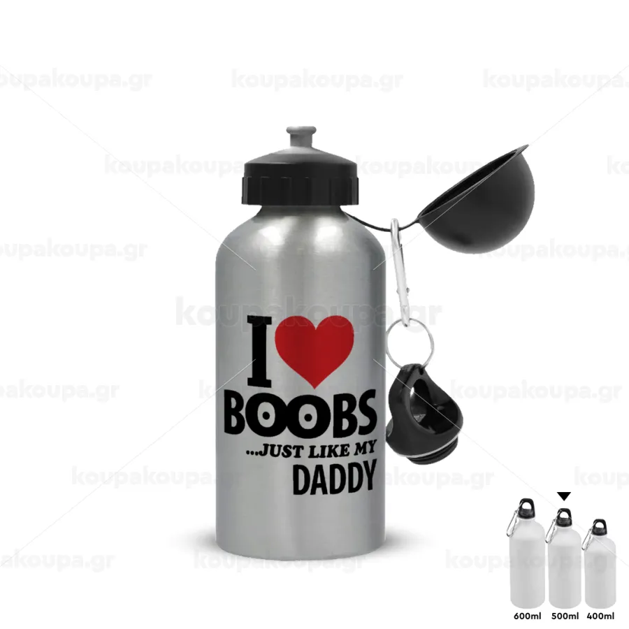 I Love boobs ...just like my daddy, Metallic water jug, Silver, aluminum 500ml