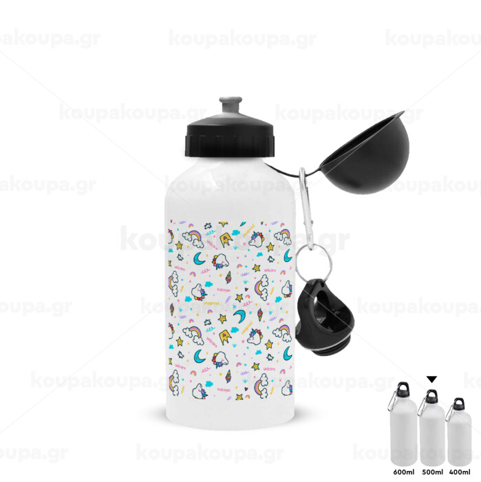 Unicorn pattern white, Metal water bottle, White, aluminum 500ml