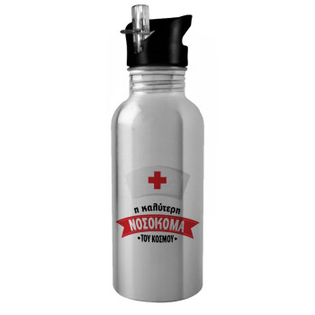 Η καλύτερη νοσοκόμα του κόσμου!!!, Water bottle Silver with straw, stainless steel 600ml