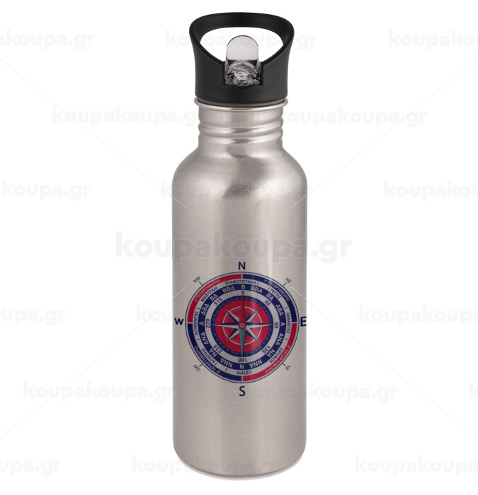 Wind compass, Water bottle Silver with straw, stainless steel 600ml