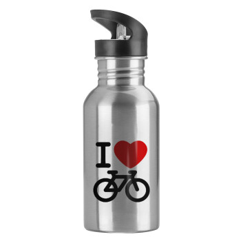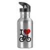 I love Bike, Water bottle Silver with straw, stainless steel 600ml